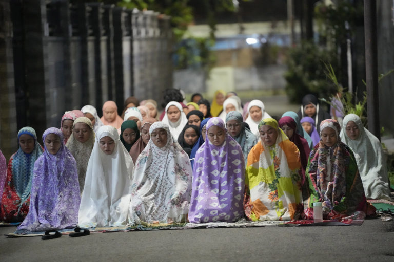 Indonézski moslimovia pred mešitou v Jakarte v Indonézii, kde sa koná večerná modlitba nazývaná „tarawih“ pri príležitosti prvého predvečera svätého pôstneho mesiaca ramadánu. Foto: SITA/AP