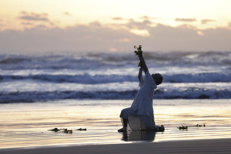 Tanečník vystupuje na pláži v Iwaki v severnom Japonsku. 11. marca 2024 si Japonsko pripomenulo 13. výročie masívneho zemetrasenia, cunami a jadrovej katastrofy. Foto: Kyodo News via AP
