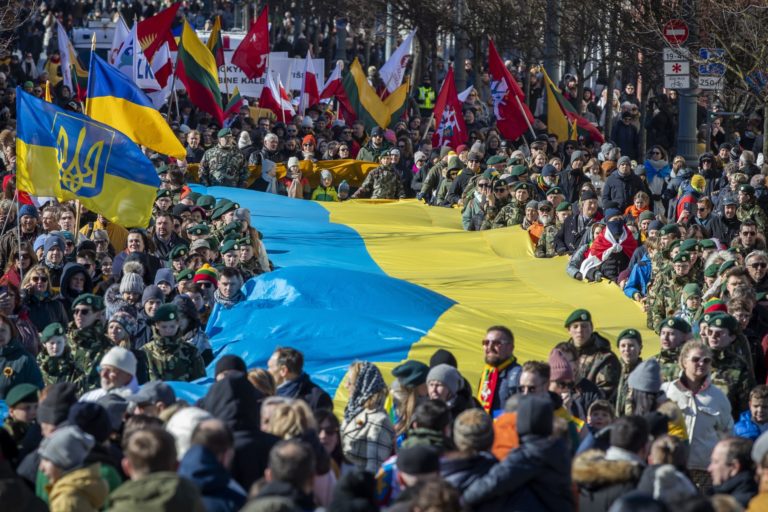 Obyvatelia Litvy nesú obrovskú ukrajinskú vlajku na protest proti ruskej invázii na Ukrajinu počas osláv nezávislosti Litvy. Foto: SITA/AP