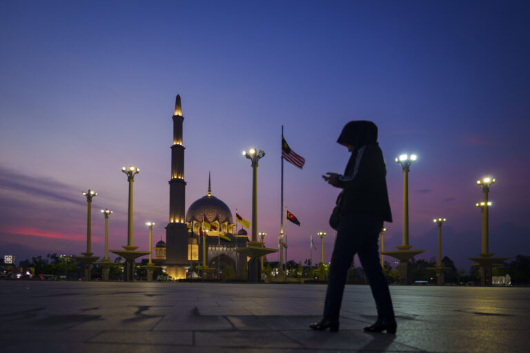 Moslimská žena kráča pred mešitou Putra počas západu slnka pred svätým pôstnym mesiacom Ramadán v meste Putrajaya v Malajzii. Foto: SITA/AP