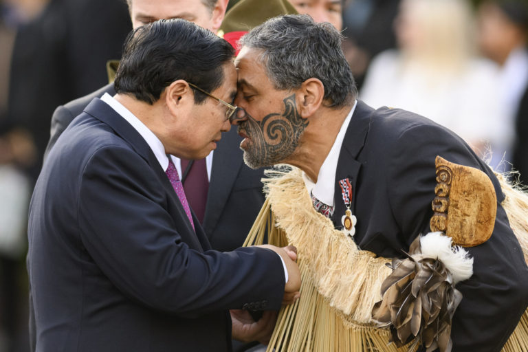 Premiér Vietnamu Pham Minh Chinh, vľavo, dostáva „hongi“, tradičný maorský pozdrav počas slávnostného uvítacieho ceremoniálu vo Wellingtone na Novom Zélande. Foto: Mark Tantrum/NZ Government via AP