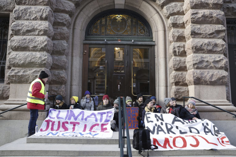 Klimatická aktivistka Greta Thunbergová, tretia zľava, a ďalší demonštranti blokujú vchod do švédskeho parlamentu počas klimatického protestu vo švédskom Štokholme. Foto: Christine Olsson/TT News Agency via AP