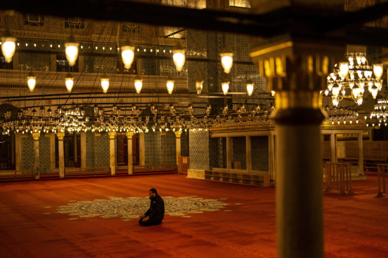 Moslimský veriaci v mešite počas prvého dňa moslimského pôstneho mesiaca ramadánu. Foto: SITA/AP