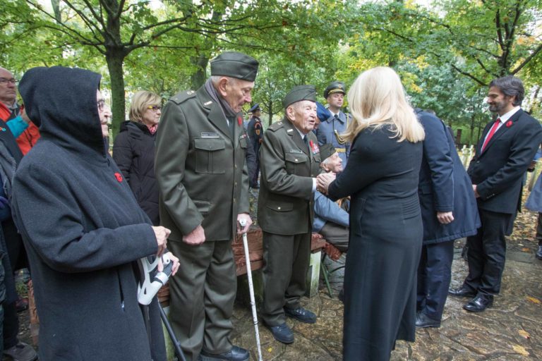 Účastnici pietnej spomienky v rámci Medzinárodného dňa veteránov pri Monumente na vojnovom cintoríne v Majeri v Banskej Bystrici. Banská Bystrica, 11. november 2023. Foto: SITA/ Jakub Julény