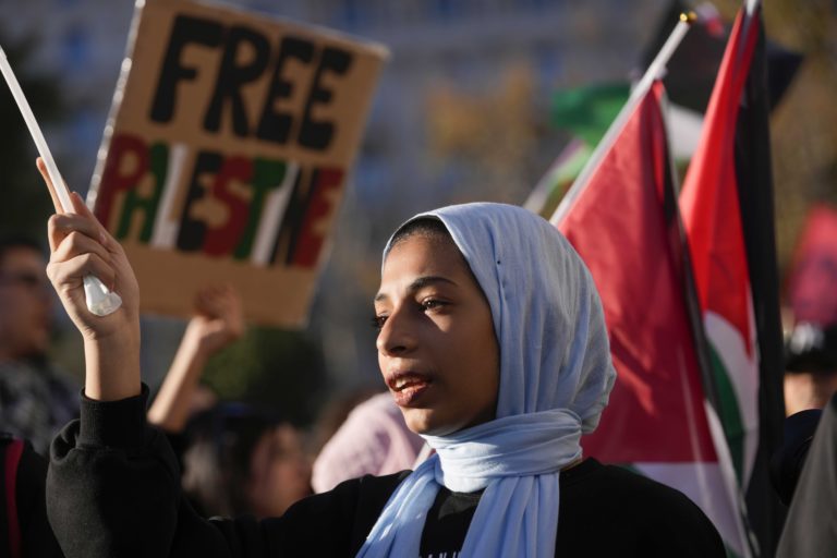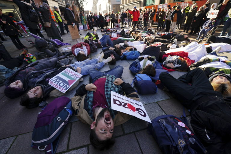 Ľudia na proteste pred demonštráciou Škótskej kampane palestínskej solidarity v škótskom Glasgowe. Foto: Jane Barlow/PA via AP