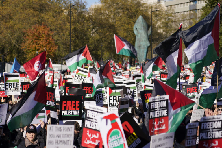 Propalestínsky protest v Londýne, Londýnska polícia zvýšila úsilie, aby zabezpečila, že propalestínsky pochod zostane pokojný po týždni politických sporov. Foto: SITA/AP