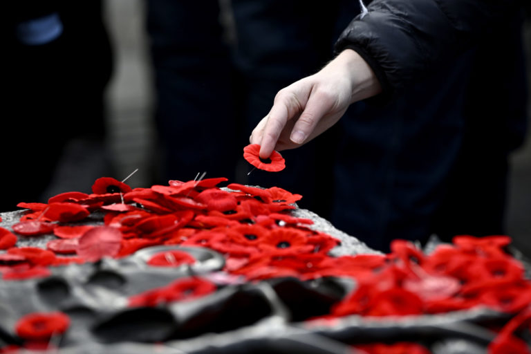 Osoba kladie mak na Hrob neznámeho vojaka po národnom spomienkovom obrade počas Dňa vojnových veteránov. Foto: Justin Tang /The Canadian Press via AP