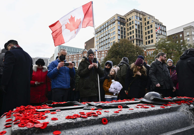 Zhromaždenie ľudí počas Národného dňa vojnových veteránov v kanadskej Ottawe. Foto: Justin Tang/The Canadian Press via AP