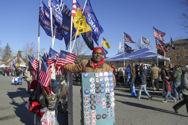 Predajca ponúkajúci tovar ľuďom pri vstupe na predvolebné zhromaždenie bývalého prezidenta Donalda Trumpa. Foto: SITA/AP