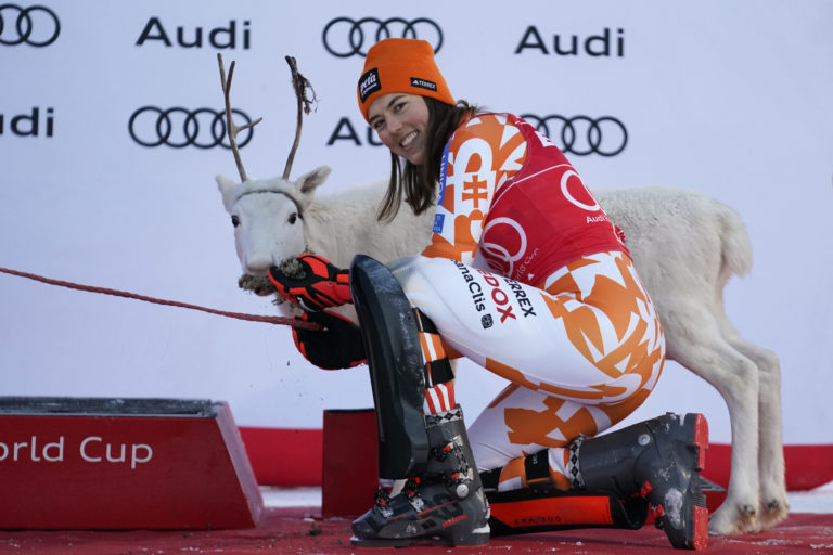 Slovenka Petra Vlhová oslavuje na pódiu so sobom po víťazstve v pretekoch Svetového pohára žien v alpskom lyžovaní v slalome žien vo fínskom Levi v sobotu 11. novembra 2023. Foto: SITA/AP