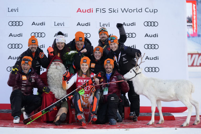 Slovenská reprezentantka v prvom rade Petra Vlhová oslavuje so svojím tímom na pódiu s mužom oblečeným ako Santa Claus a sobom po víťazstve v pretekoch Svetového pohára žien v slalome v alpskom lyžovaní vo fínskom Levi v sobotu 11. novembra 2023. Foto: SITA/AP