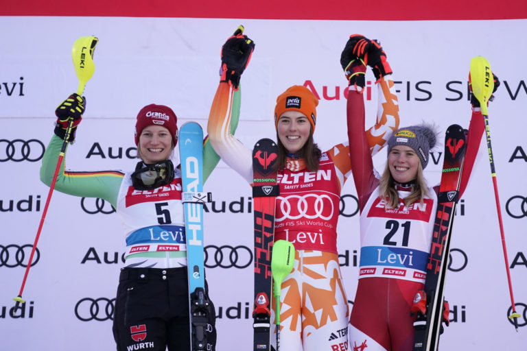 Slovenka Petra Vlhová, víťazka pretekov Svetového pohára v slalome žien v alpskom lyžovaní, oslavuje s druhou Nemkou Lenou Duerrovou (vľavo) a treťou Rakúšankou Katharinou Liensbergerovou. vo fínskom Levi, sobota 11. novembra 2023. Foto: SITA/AP