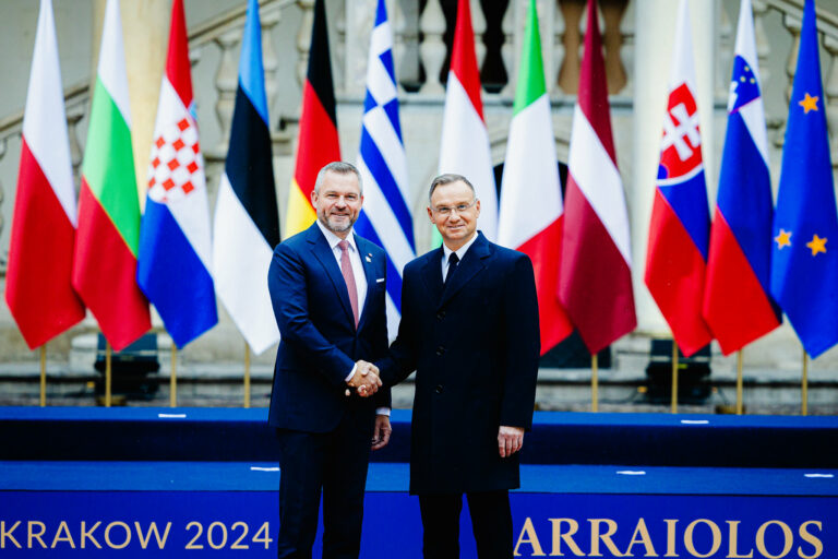 Zľava: Prezident SR Peter Pellegrini a prezident Poľskej republiky Andrzej Duda počas samitu prezidentov jedenástich štátov Európskej únie (EÚ) skupiny Arraiolos v meste Krakov v Poľskej republike. Krakov, Poľsko, 11. október 2024. Foto: SITA/Kancelária prezidenta SR