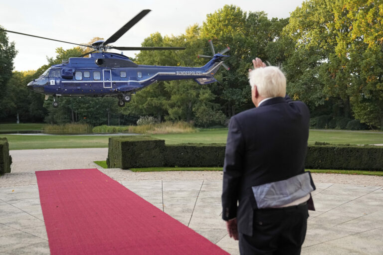 Nemecký prezident Frank-Walter Steinmeier sa lúči s ukrajinským prezidentom Volodymyrom Zelenským, ktorý opustil zámok Bellevue vo vrtuľníku. Berlín, 11. október 2024. Foto: SITA/AP