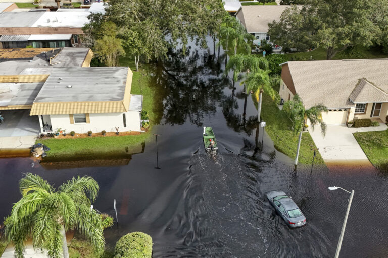 Člen úradu šerifa okresu Pasco vyrazil v člne na pomoc obyvateľom uväzneným v ich domoch, keď sa následkom hurikánu Milton v americkom štáte Florida vyliala rieka Anclote. New Port Richey, 11. október 2024. Foto: SITA/AP