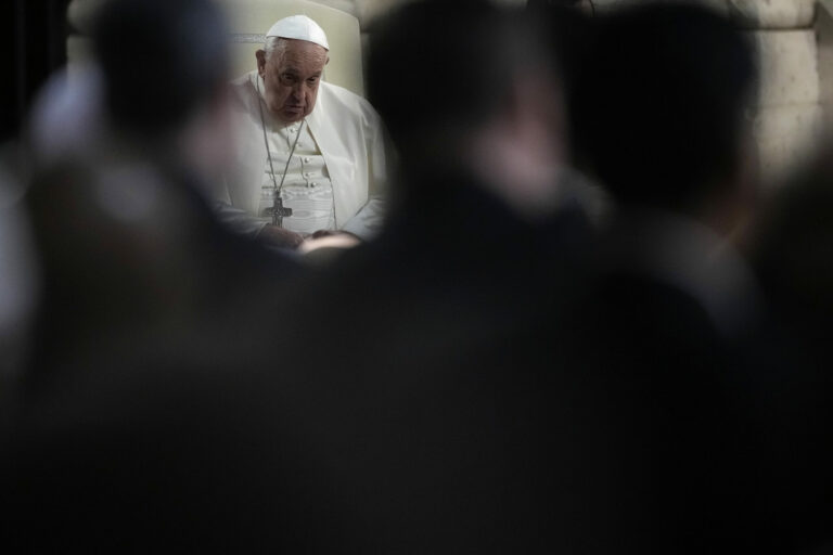 Pápež František počas ekumenickej modlitby pred Aulou Pavla VI., kde sa koná Synoda biskupov. Vatikán, 11. október 2024. Foto: SITA/AP