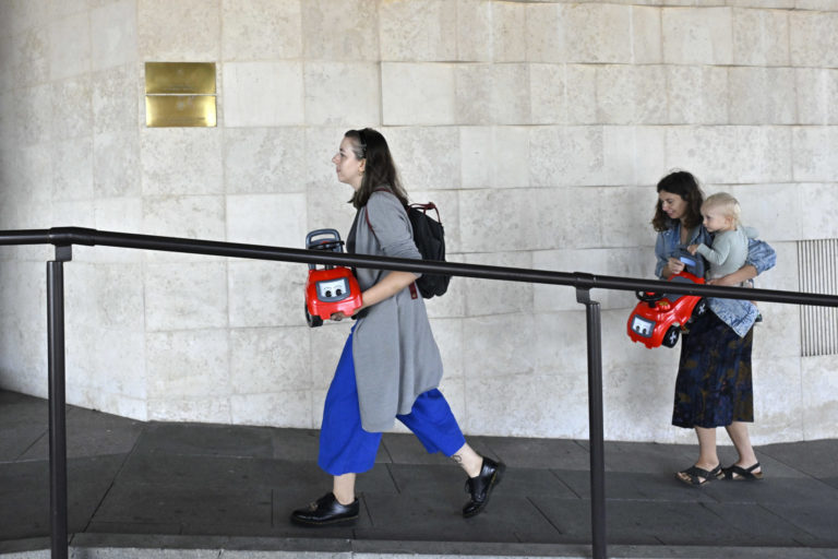 Atmosféra počas happeningu občianskeho združenia Znepokojené matky pred Národnou radou SR na tému: Štvorkolkový zákon - vláda má chrániť ľudí pred klimatickou krízou, nie štátnych tajomníkov, ktorí sa chcú hrať. Bratislava, 11. september 2024. Foto: SITA/Milan Illík