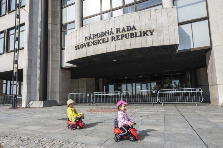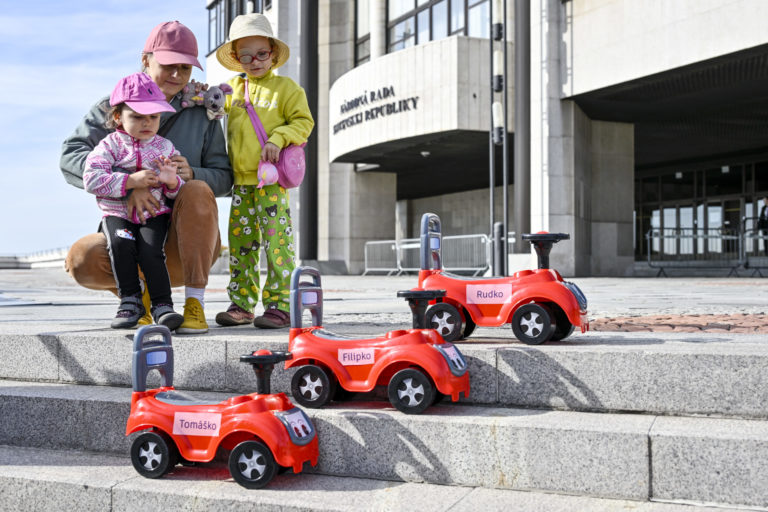 Atmosféra počas happeningu občianskeho združenia (OZ) Znepokojené matky pred budovou Národnej rady SR na tému: Štvorkolkový zákon - vláda má chrániť ľudí pred klimatickou krízou, nie štátnych tajomníkov, ktorí sa chcú hrať. Bratislava, 11. september 2024. Foto: SITA/Milan Illík