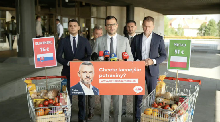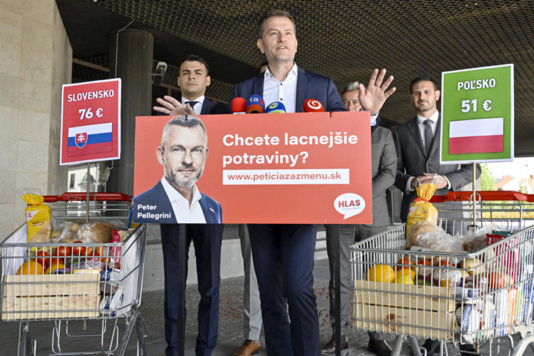 Zľava: Poslanci parlamentu za hnutie Slovensko Peter Pollák mladší, Igor Matovič, Jozef Pročko a Rastislav Krátky počas tlačového brífingu hnutia SLOVENSKO pred Národnou radou SR na tému: Sľúbili znížiť ceny potravín, za 11 mesiacov vláda neurobila nič. Bratislava, 11. september 2024. Foto: SITA/Milan Illík