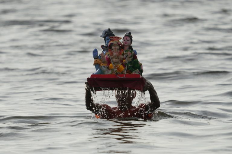 Veriaci ponárajú modlu hinduistického boha Ganešu so slonou hlavou do Arabského mora. Foto: SITA/AP