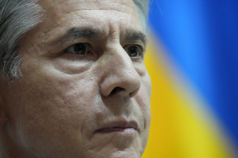 Americký minister zahraničných vecí Antony Blinken na spoločnej tlačovej konferencii s britským ministrom zahraničných vecí Davidom Lammym. Foto: SITA/AP