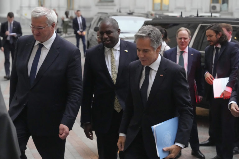 Americký minister zahraničných vecí Antony Blinken (vpravo), britský minister zahraničných vecí David Lammy a ukrajinský minister zahraničných vecí Andrij Sybiha (vľavo). Foto: SITA/AP