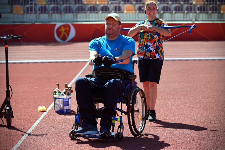 Dvojnásobný paraolympijský bronzový medailista Marián Kuřeja počas 5. ročníka vrhačského mítingu pre hendikepovaných športovcov Handi Open 2023 v rámci šesťdielneho seriálu medzinárodnej ligy Para Moravia Cup na atletickom štadióne SNP Dukla na Štiavničkách Banskej Bystrici. Foto: SITA/Jakub Julény.