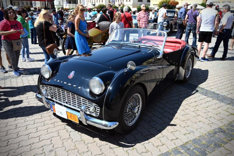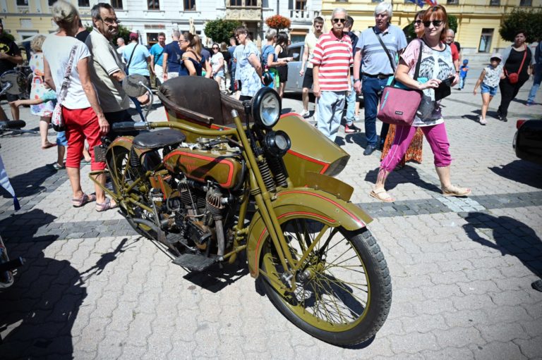Historické vozidlo počas 9. ročníka tradičnej prehliadky historických vozidiel a motoriek The Grand Retro Show 2023 na Námestí SNP v Banskej Bystrici. Foto: SITA/Jakub Julény.