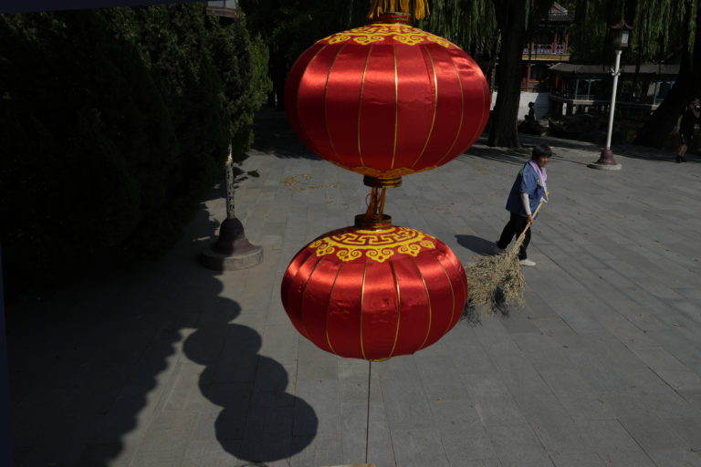 Pracovník zametá lístie v jednom z parkov v Pekingu. Foto: SITA/AP.