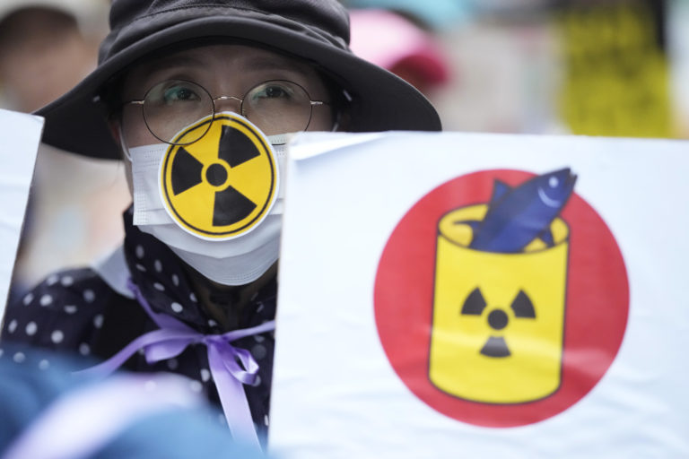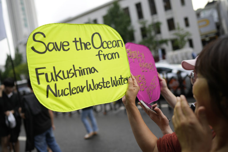 Protest v juhokórejskom Soule proti plánom Japonsko vypustiť rádioaktívnu vodu z poškodenej jadrovej elektrárne Fukušima do oceánu. Foto: SITA/AP.