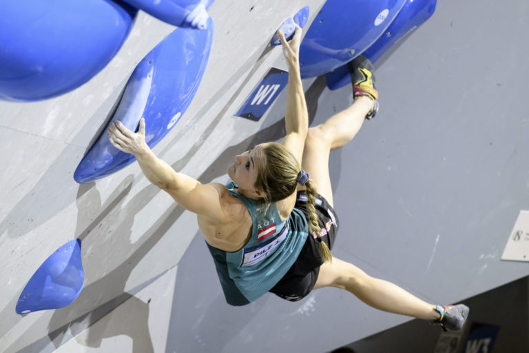 Rakúska reprezentantka Jessica Pilzová na majstrostvách sveta v lezení vo švajčiarskom Berne. Foto: Anthony Anex/Keystone via AP.