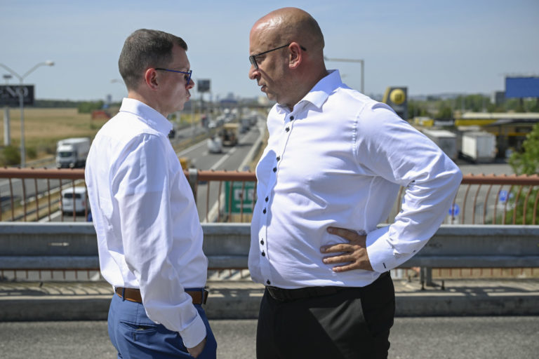 Zľava: Generálny riaditeľ Národnej diaľničnej spoločnosti (NDS) Filip Macháček a minister dopravy SR Jozef Ráž počas tlačového brífingu ministra dopravy a generálneho riaditeľa NDS na tému: Historicky najvyššia investícia Národnej diaľničnej spoločnosti na nepoužívanom moste nad D1 na Zlatých Pieskoch v Bratislave. Bratislava, 12. august 2024. Foto: SITA/Milan Illík.