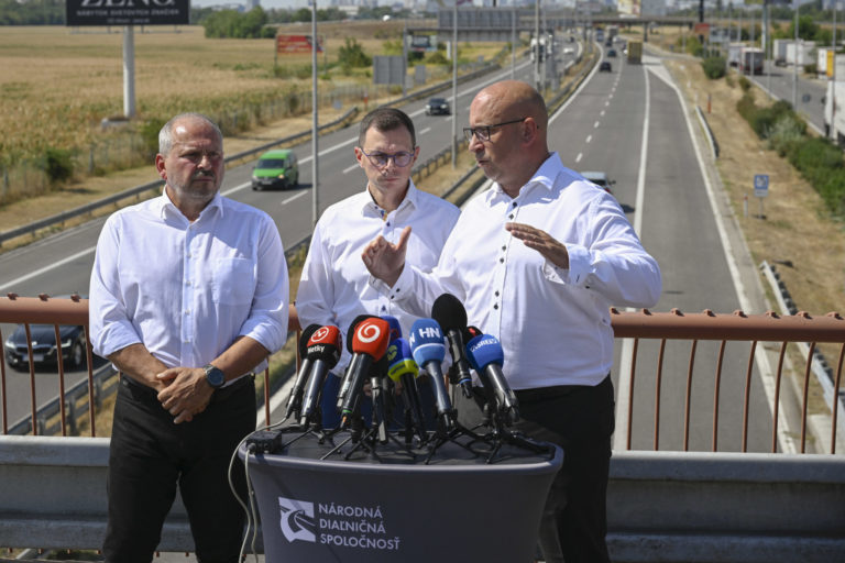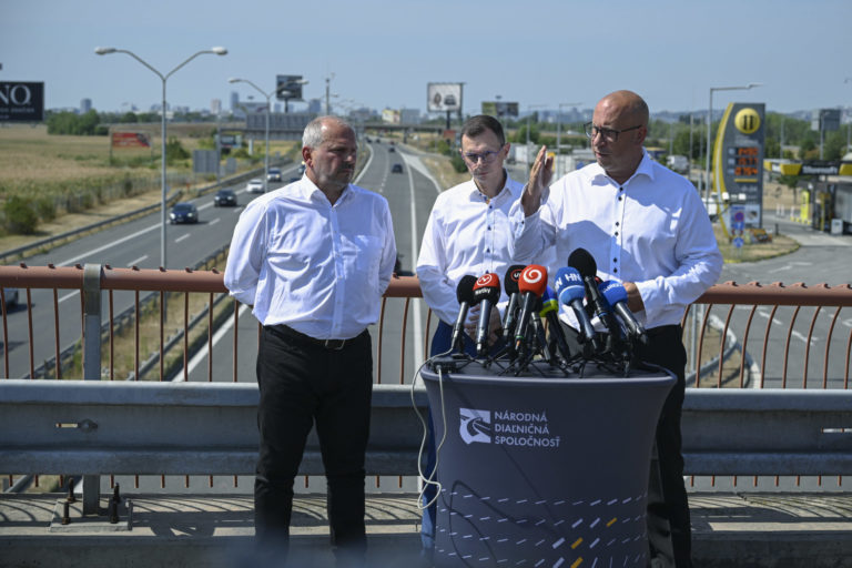 Zľava: Štátny tajomník Ministerstva dopravy (MD) SR Igor Choma, generálny riaditeľ Národnej diaľničnej spoločnosti (NDS) Filip Macháček a minister dopravy SR Jozef Ráž počas tlačového brífingu ministra dopravy a generálneho riaditeľa NDS na tému: Historicky najvyššia investícia Národnej diaľničnej spoločnosti na nepoužívanom moste nad D1 na Zlatých Pieskoch v Bratislave. Bratislava, 12. august 2024. Foto: SITA/Milan Illík.