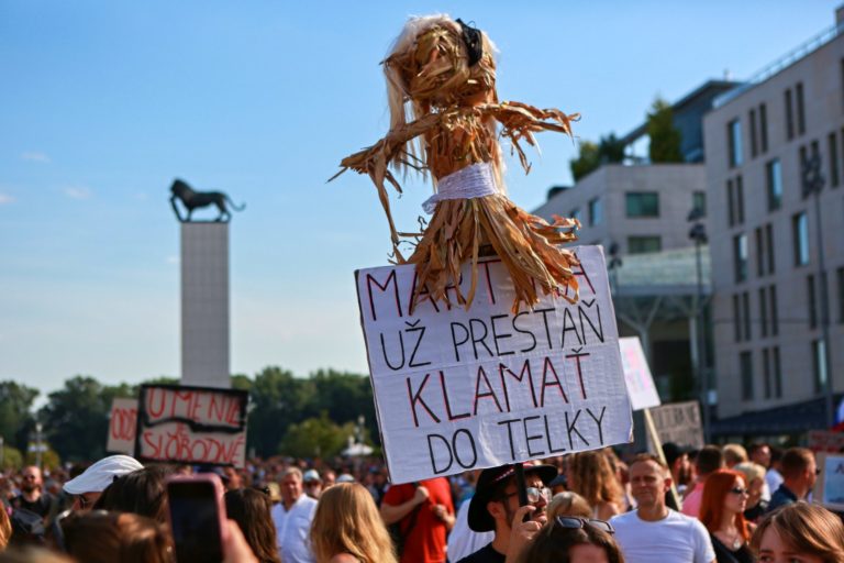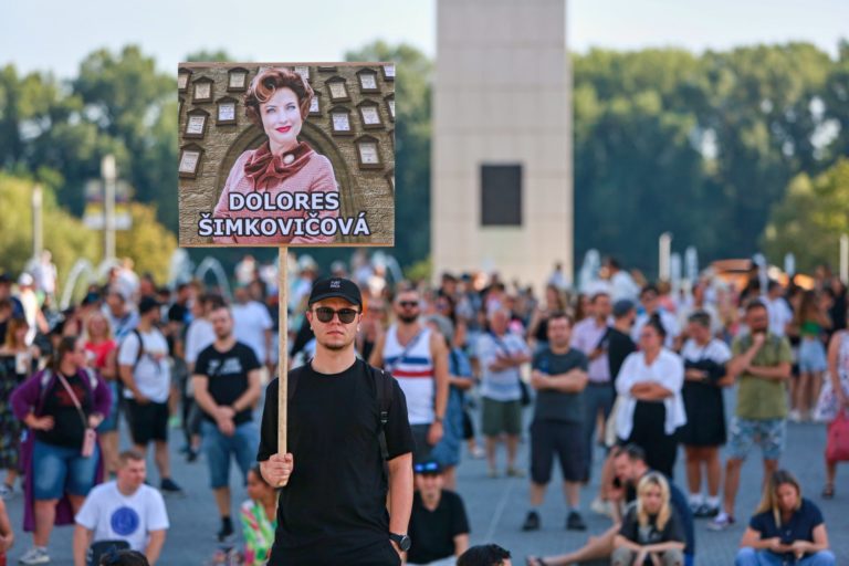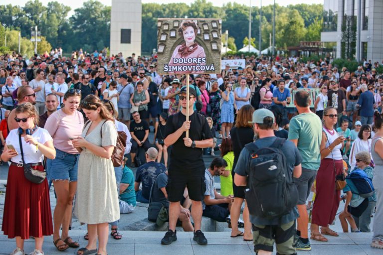 Atmosféra počas pochodu od novej budovy SND v rámci protestu na obranu kultúry. Bratislava 12. august 2024. Foto: SITA/Tomáš Susko