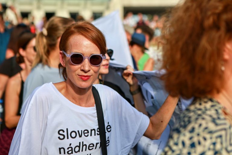 Herečka Táňa Pauhofová počas pochodu od novej budovy SND v rámci protestu na obranu kultúry. Bratislava 12. august 2024. Foto: SITA/ Tomáš Susko.