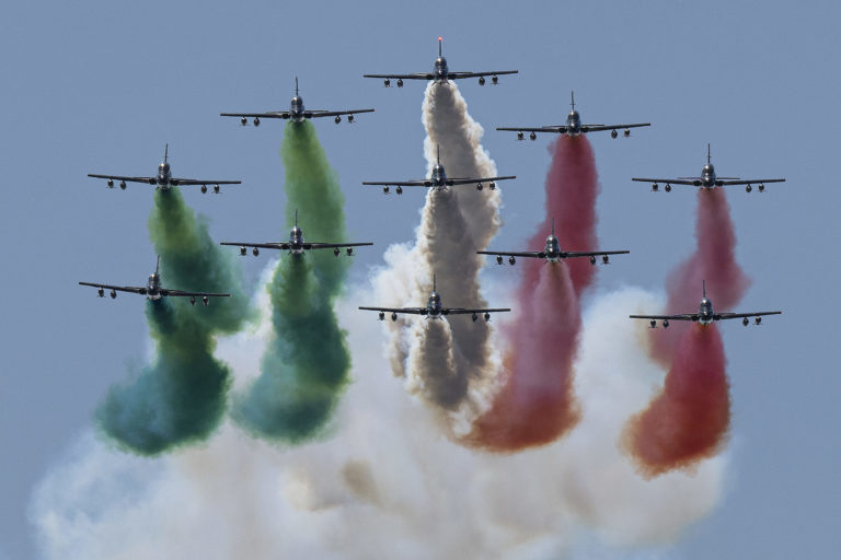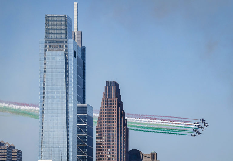 Lietadlá talianskych vzdušných síl Frecce Tricolori nad centrom Filadelfie. Foto: Jose F. Moreno/The Philadelphia Inquirer via AP
