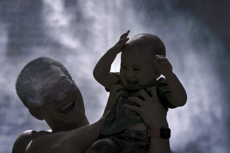 Otec so svojím dieťaťom počas horúcich dní v Pekingu. Foto: SITA/AP