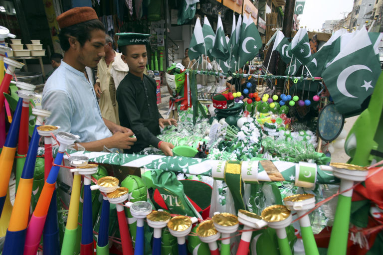 Pakistanec predáva vlajky, odznaky a masky v Pešávare. Foto: SITA/AP