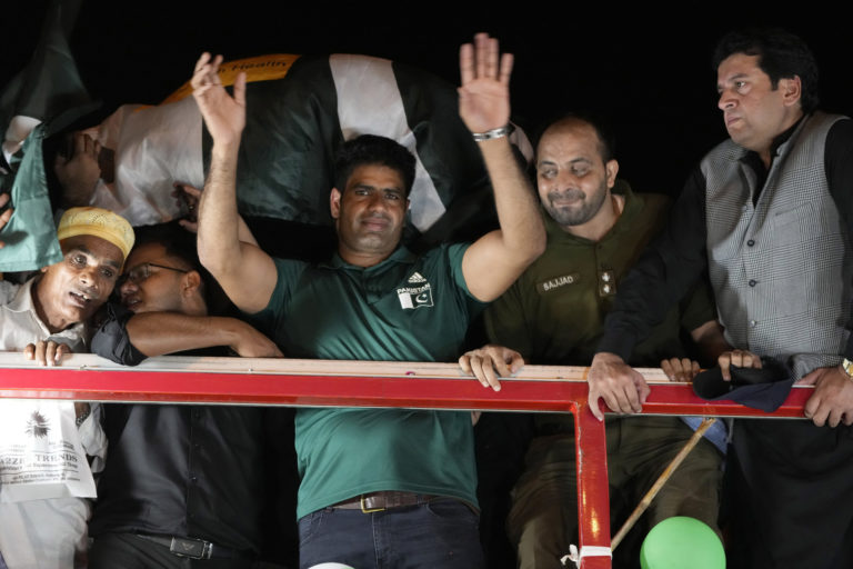 Pakistanského oštepára Nadeema vítali v rodnej krajine tisícky fanúšikov. Foto: SITA/AP.