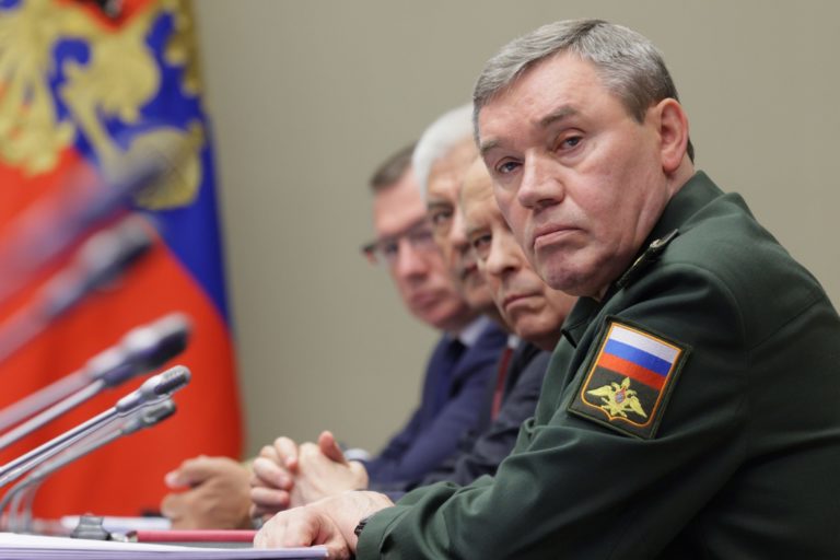Náčelník ruského generálneho štábu generál Valerij Gerasimov na stretnutí s ruským prezidentom Vladimírom Putinom. Foto: Gavriil Grigorov, Sputnik, Kremlin Pool Photo via AP