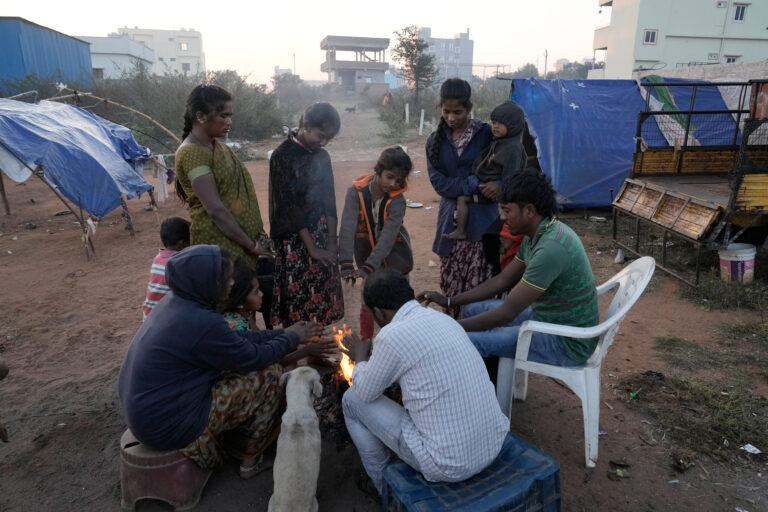 Ľudia so psom sa zohrievajú okolo ohňa počas chladného rána v Hajdarábáde. India, 12. decembra 2025. Foto: AP Photo/Mahesh Kumar A.
