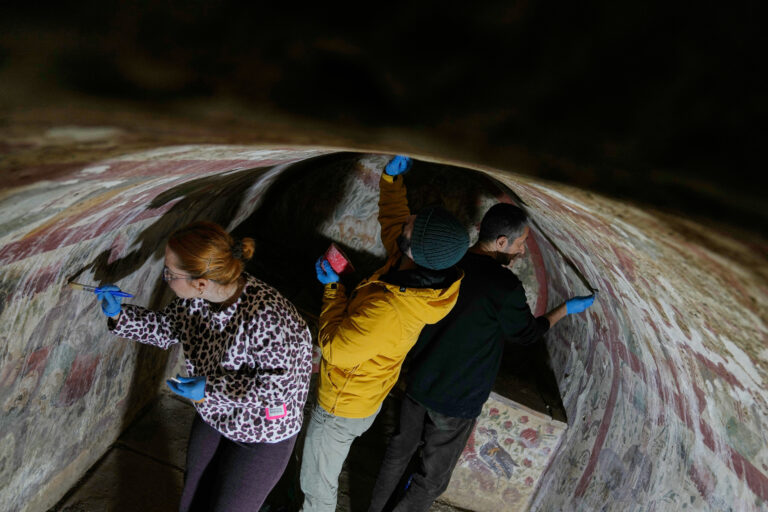 Archeológovia čistia a reštaurujú fresky v hrobke z 3. storočia v Izniku, kde objavili vzácne ranokresťanské zobrazenie Ježiša ako „Dobrého pastiera“. Turecko, 12. december 2025. Foto: AP Photo/Khalil Hamra