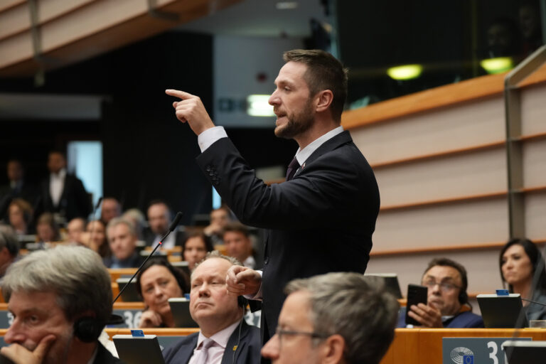 Poslanec Európskeho parlamentu Milan Uhrík zo skupiny Európa suverénnych národov počas spomienkového podujatia pri príležitosti 10. výročia parížskych útokov z 13. novembra 2015 v Európskom parlamente v Bruseli. Belgicko, 12. novembra 2025. Foto: AP Photo/Virginia Mayo