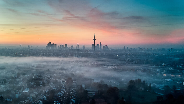 Hmla vznášajúca sa nad okrajovými časťami Frankfurtu v skorých ranných hodinách. Nemecko,12. novembra 2025. Foto: AP Photo/Michael Probst