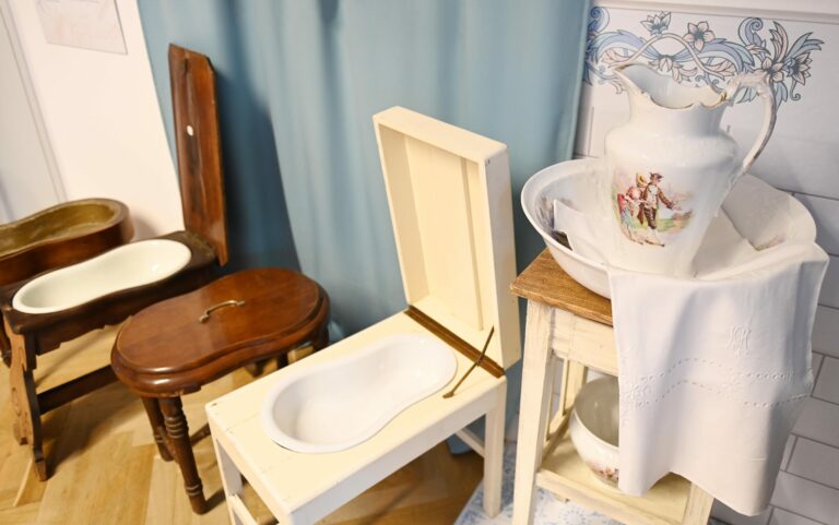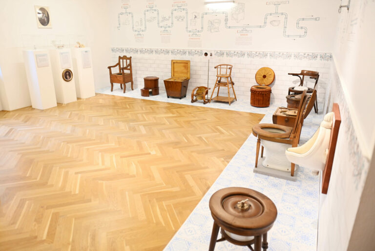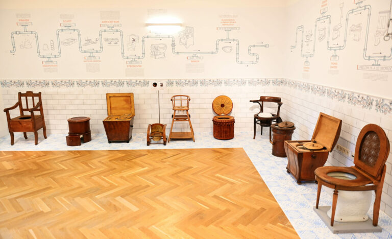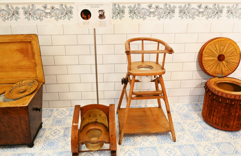 Výstava s názvom Príbeh čistoty v Dubnickom múzeu v priestoroch kaštiela v Dubnici nad Váhom o starostlivosti hygieny ľudí v rôznych obdobiach histórie. Návštevníci si do 6. januára 2025 môžu prezrieť niekoľko typov toaliet ale aj toaletných pomôcok danej doby. Dubnica nad Váhom, 5. september 2024. Foto: SITA/Tomáš Somr.