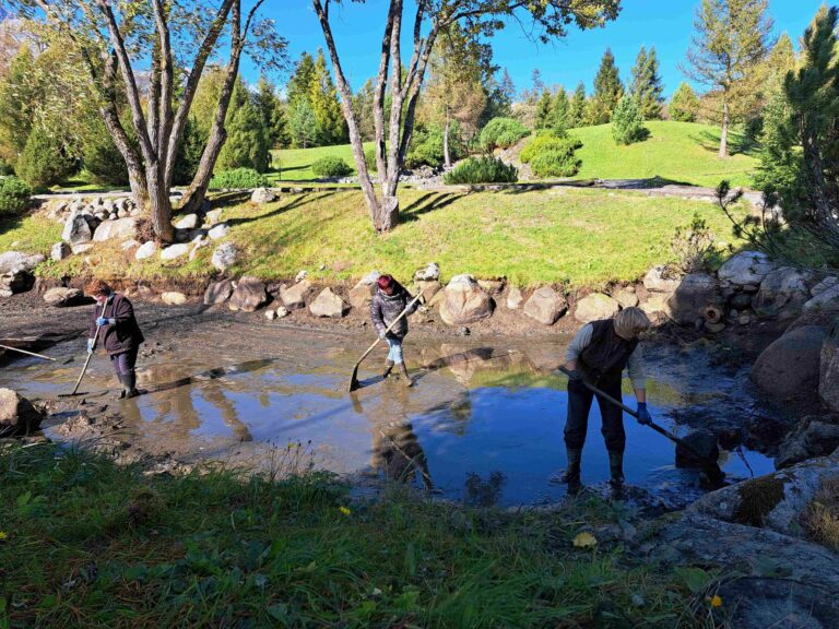 Čistenie jazierka v Expozícii tatranskej prírody v Tatranskej Lomnici vo Vysokých Tatrách, ktorá patrí pod Správu Tatranského národného parku, počas prác zameraných na prípravu na jej zimný oddych. Tatranská Lomnica, 10. október 2024. Foto: SITA/Mária Frisová