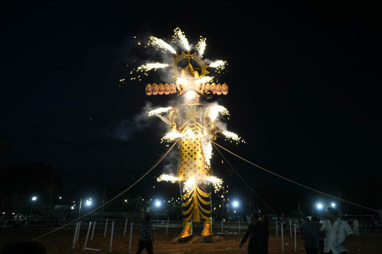 Ľudia prechádzajú okolo podobizne mýtického kráľa démonov Ravana, ktorý sa vznáša v plameňoch, čo znamená koniec festivalu Dussehra v Ahmedabad, India, v sobotu 12. októbra 2024. Foto: SITA/AP