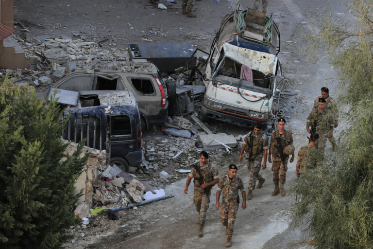Vojaci libanonskej armády prechádzajú okolo zničených áut na mieste, kde izraelský nálet zasiahol budovu, v dedine Barja, južne od Bejrútu v Libanone, sobota 12. októbra 2024. Foto: SITA/AP
