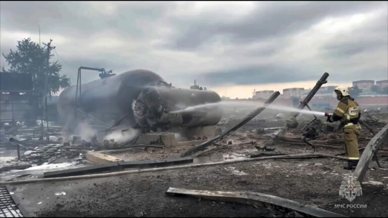 Na tejto fotografii prevzatej z videa zverejneného tlačovou službou ruského ministerstva pre mimoriadne situácie v sobotu 12. októbra 2024 hasiči hasia rozsiahly požiar po výbuchu na čerpacej stanici v Groznom, hlavnom meste Čečenskej republiky Ruska, pri ktorom zahynuli najmenej štyria ľudia. Foto: Russian Emergency Ministry Press Service via AP