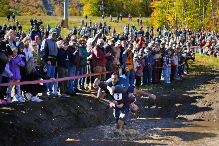 Šampionát North American Wife Carrying Championship v sobotu 12. októbra 2024 v lyžiarskom stredisku Sunday River v Newry, Maine. Foto: SITA/AP